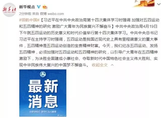 中共中央总书记习近平在主持学习时强调,五四运动是我国近现代史上具有里程碑意义的重大事件,五四精神是五四运动创造的宝贵精神财富。今天,我们纪念五四运动、发扬五四精神,必须加强对五四运动和五四精神的研究,以引导广大青年在五四精神激励下,为决胜全面建成小康社会、夺取新时代中国特色社会主义伟大胜利、实现中华民族伟大复兴的中国梦不懈奋斗。